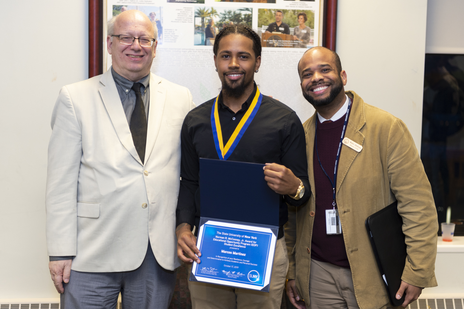 Marcos L. Martinez, a Practical Nursing major from the Bronx, received the 2019 Norman R. McConney Jr. Award, which is bestowed to recognize excellence in the SUNY Educational Opportunity Program (EOP). The award is named after one of the architects of the statewide program that provides financial assistance and support to those facing obstacles in achieving their educational and personal goals.